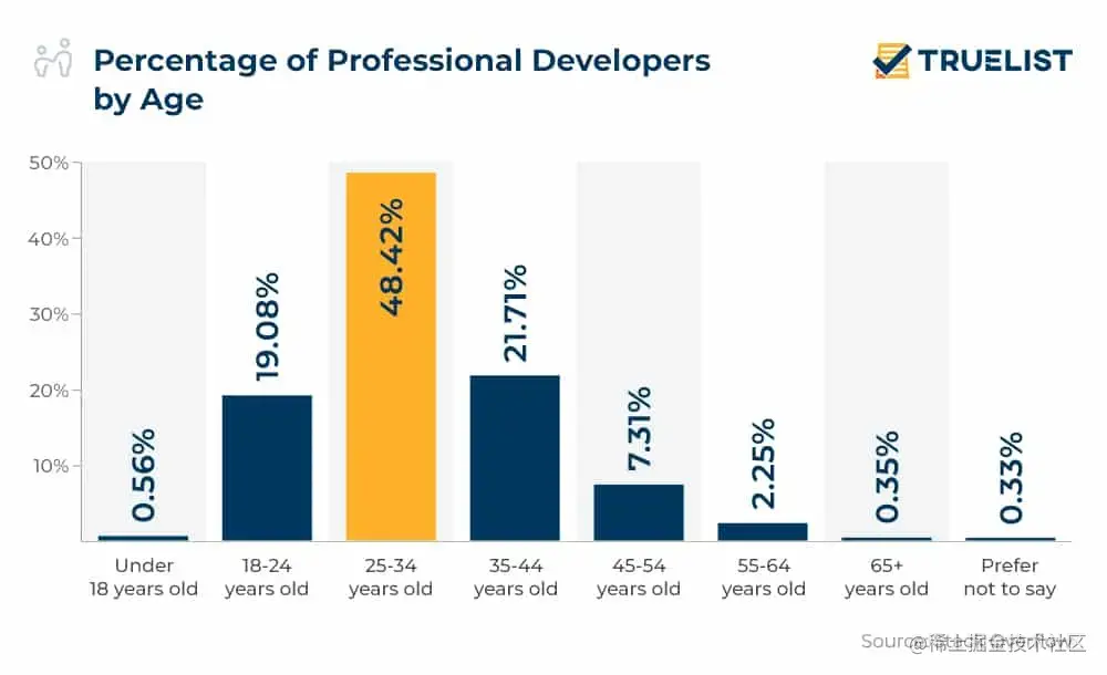3、程序员都很年轻,48.42%的人在 25 到 34 岁之间。
