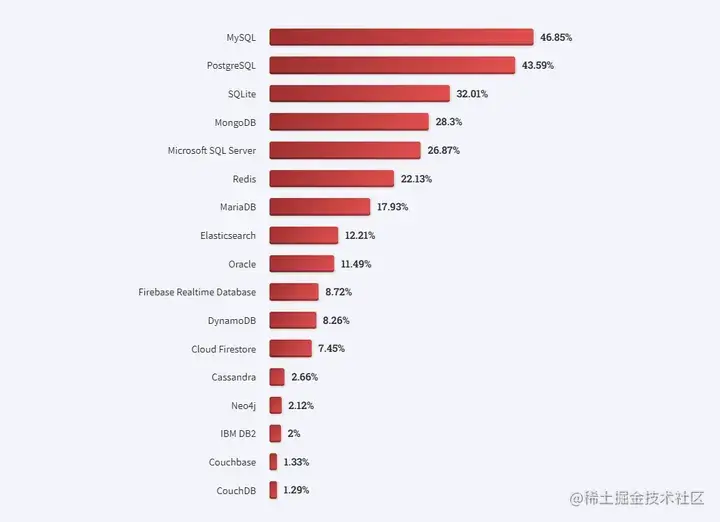 MySQL依然是最受欢迎的数据库,对于专业开发人员来说,PostgreSQL更受欢迎。越来越多的程序员喜欢MongoDB,因为它支持大量语言和应用程序开发平台。