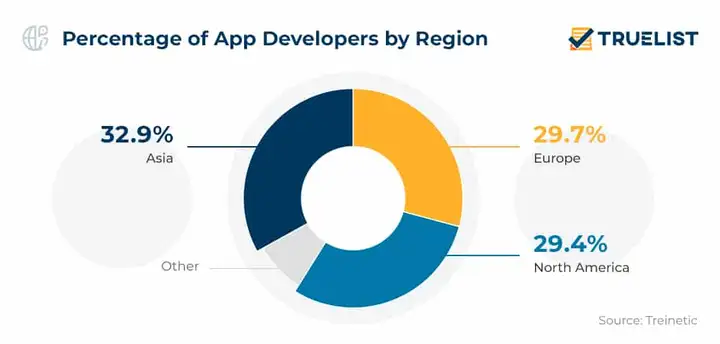 其中亚洲以最多的软件开发人员(32.9%)主导市场,其次是欧洲29.7%,北美洲29.4%。
