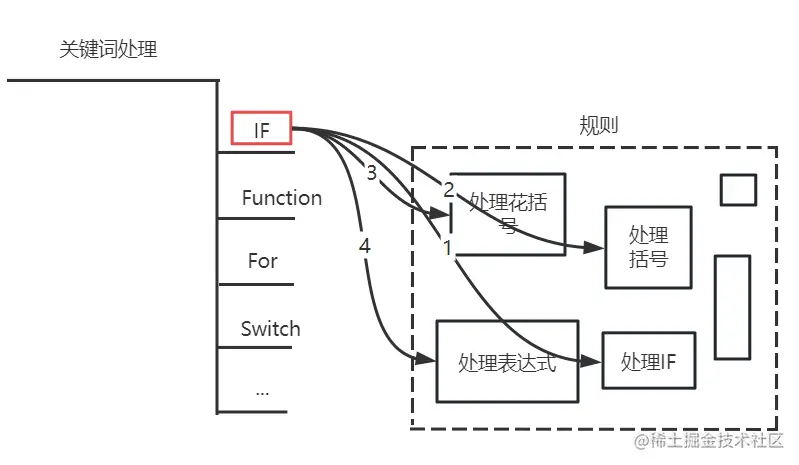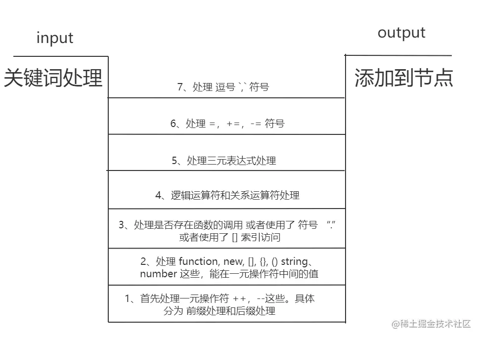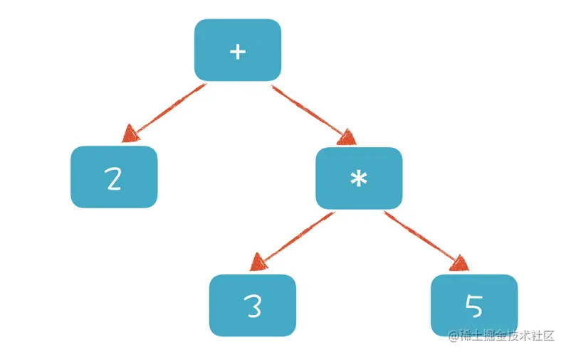 不同的关键词都有不同的处理方法,需要根据实际再去细节处理,这里需要注意的是再处理逻辑运算符和关系运算符时候还需要设置不同优先级 < 和 >优先级 < + 和 - 优先级 < * 和 `` 优先级,根据不同优先级来去实现深度优先的嵌套关系,比如这样的一个2 + 3 * 5 该如何处理呢参考下面代码