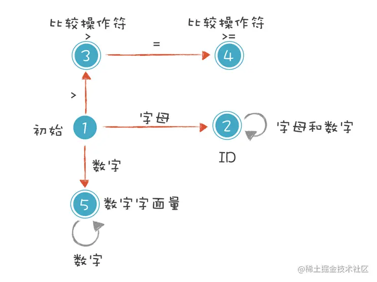 根据每个字符的所在的不同区间去判断这里还有一个名词是 有限自动机 类似于下图,出现在初始阶段会判断是否是字母然后去判断 字母后是否还是字母或者是数字,是就循环的此操作,否:进行下一个到达 3 判断是否是操作符,是就循环判断是不是 >= 符号,不是就进行下一次判断 是不是 数字是就循环判断 其实就是判断+循环的过程。