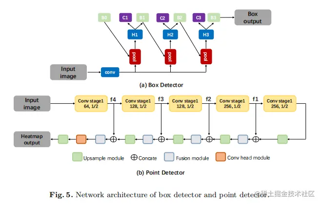 作者所提出的方法的总体架构如图4所示。在功能上,该框架由三个组成部分组成:一个预先训练好的图表分类模型,用于检测边框或点的元素检测模块,以及用于确定元素值的数据转换。在下面的部分中,作者首先介绍box detector和point detector的细节。接下来,作者将提供数据转换的实现细节。