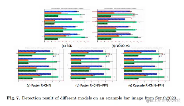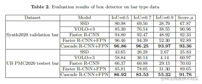 为了进行比较,作者实现了不同的检测模型,包括one-stage和two-stage的检测模型。one-stage模型是SSD 和YOLO-v3而two-stage模型是Faster R-CNN。如表2所示,one-stage模型的性能表现最差,多级回归磁头有助于获得较高的精度。此外,附加的FPN结构有效地有助于检测具有较大高宽比范围的元素。在Synth2020和UB PMC2020数据集上,具有FPN结构的Cascade R-CNN模型表现最好。因此,对于条形数据检测,具有多元回归头和FPN结构的模型取得了令人印象深刻的性能。