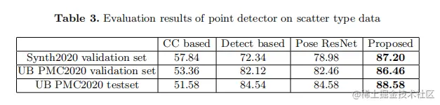 在本节中,将根据竞赛中发布的评价机制来评估point detector的性能。训练后的模型在Synth2020验证、UB PMC2020验证和测试集上进行了测试。