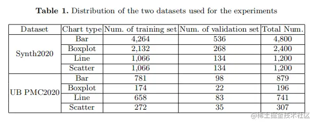 本研究中使用了两组数据集,分别为Synth2020和UB PMC2020。第一个数据集Synth2020,是Synth2019的扩展版本。使用Matplotlib库创建了多个不同类型的图表。第二个数据集是来自PubMedCentral的科学出版物中的真实图表,它具有不同的图像分辨率和更多的图像不确定性。作者将ICPR2020官方训练数据集随机分为训练集和验证集。表1给出了这两个数据集分割的详细信息。