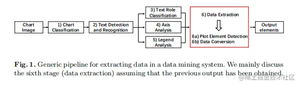 如图1所示,图表数据挖掘系统一般包括以下六个阶段:图表分类、文本检测和识别、文本角色分类、轴分析、图例分析和数据提取。在上述所有阶段中,数据提取是最关键、最困难的部分,其性能取决于定位的质量。在本工作中,作者主要讨论了数据提取阶段。本阶段的目标是检测地块区域中的元素,并将它们转换为具有语义的数据标记。