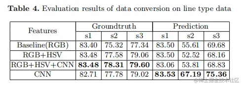 作者选择行型数据来评估数据转换的性能。数据转换的性能取决于图例匹配阶段和值计算阶段。值计算阶段的性能取决于OCR引擎是否能正确识别勾点值。忽略了OCR引擎引起的误差,作者讨论了从训练网络的图例匹配阶段提取的特征的鲁棒性。如表4所示,作者比较了对ground truth和预测结果进行图例匹配阶段时的性能。对于简短的表示法,这里的s1、s2、s3分别表示平均名称得分、平均数据序列得分和平均得分,这在评估脚本中声明。