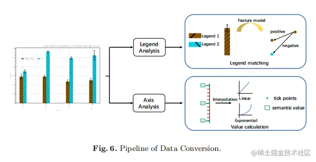 在检测到元素之后,作者需要确定元素的值。在这个阶段,目标是将绘图区域中检测到的元素转换为具有语义值的数据标记。如图6所示,本阶段进行了图例匹配和值计算。