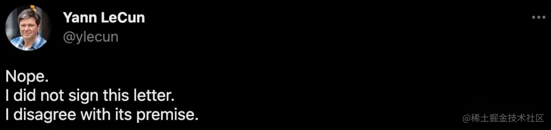 但也存在着不同的声音,就如同样作为图灵奖得主的 Yann LeCun 并没有签署该公开信:「我不同意这个前提。」。