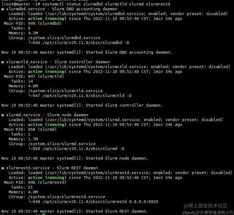 注:如果在一些安装步骤忘记修改主机名称,可能会出现slurmctld启动失败的情况,通常错误为:error: This host(master) not a valid controller可以将slurm.conf中ControllerMachine修改成主机名称即可(master)