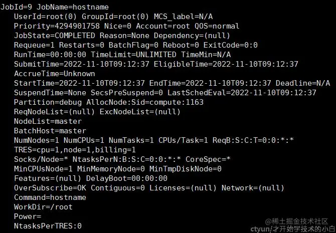 如果作业执行时间较长,可以用squeue指令查看作业排队情况;如果已经执行完成,可以使用scontrol show job来查看所有已经执行的任务,如hostname: