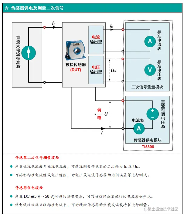 TI5800传感器供电与输出量测试仪集成了精密电压表、精密电流表、程控可调电压源,在测试电压或电流传感器时为其供电,并精准测量传感器的二次输出电流Is或电压Us。该仪器可与标准电流源或电压源组建传感器检测装置,实现对电压或电流传感器的测试。