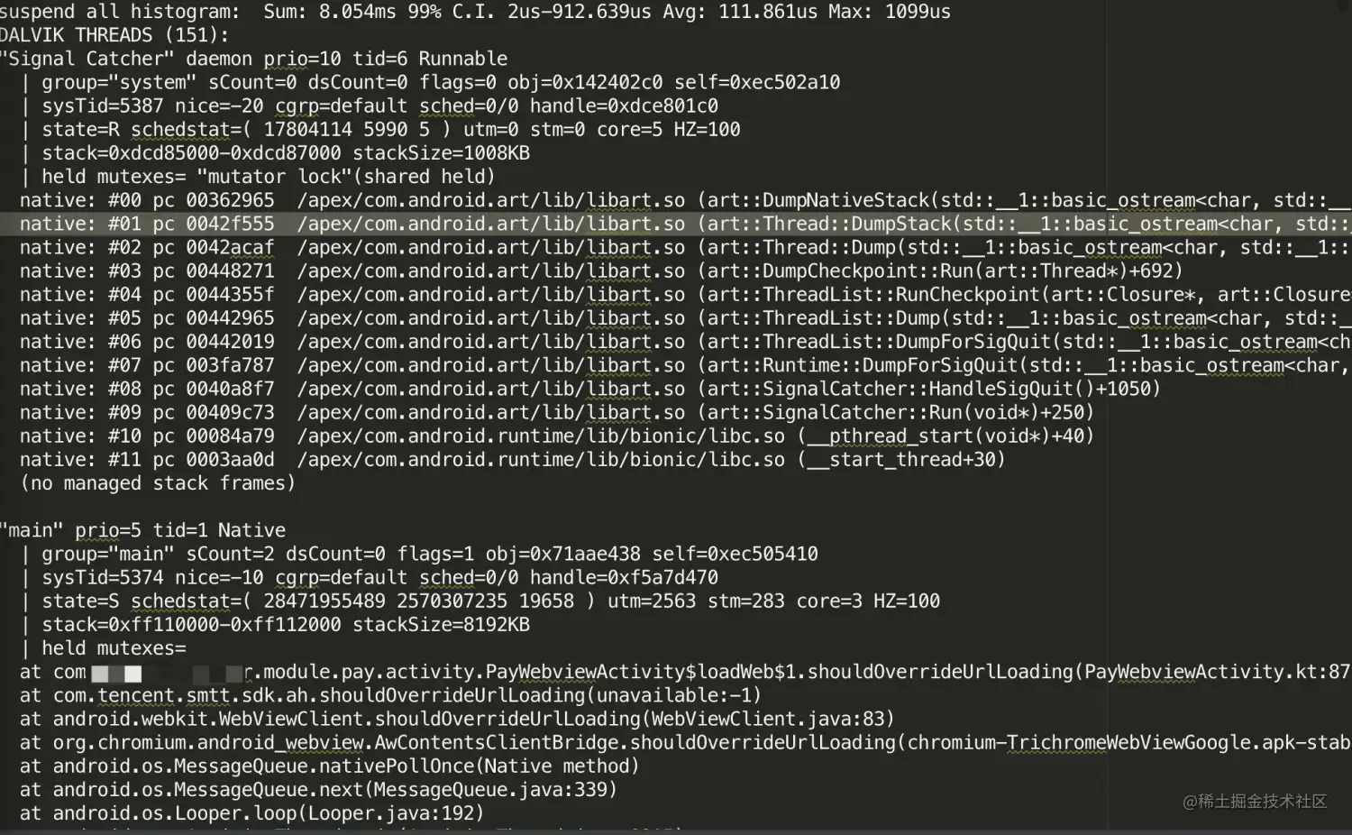 - 堆栈、设备、OS版本、进程、线程名、Logcat