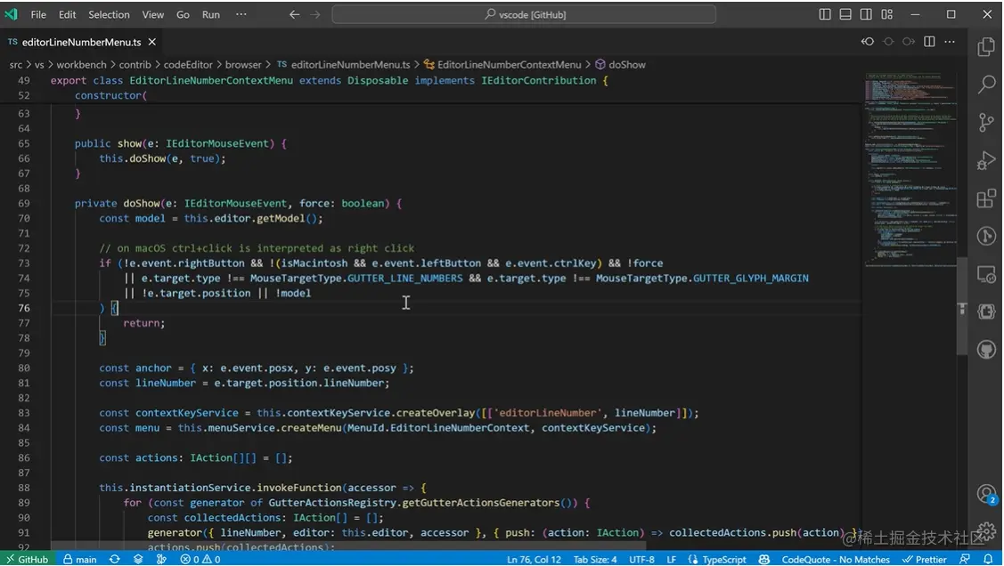 现在你可以在 GitHub 仓库中工作时,从 editor gutter 中复制 editor line 或 range 的 deep links。在 VS Code Desktop 中,为了能够从 editor gutter 中创建 GitHub permalinks 和 HEAD 链接,你需要安装 GitHub Pull Requests and Issues 扩展。在 在 vscode.dev 中,GitHub 仓库的 deep links 是开箱即用的。