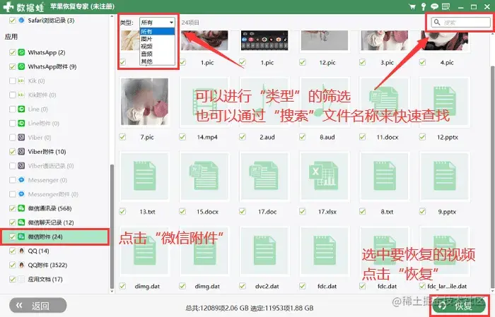 步骤3:在界面左侧点击**【微信附件】,我们就可以看到关于微信的数据。在出来的数据界面,我们可以通过【类型】**来进行筛选,也可以直接搜索文件名称来进行查找;