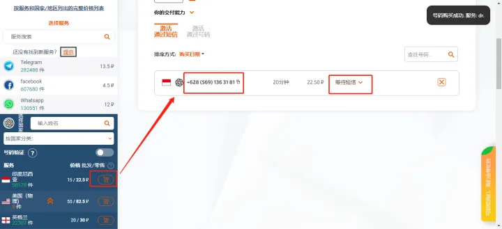 找到可用的手机号码,可以在Sms-Activate的购物车里等待短信。