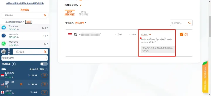 充值之后,页面左侧栏找到OpenAI选项,点击选择你要购买临时号码的国家(建议选择欧美国家),找一个收费便宜的国家即可,然后平台自动扣除账户金额,这个步骤需要注意,没想好之前不好点购物车图标,点了就直接扣费,这个号码就自动进入你的接码list中,复制这个号码,再回到ChatGPT网站,填写复制的手机号