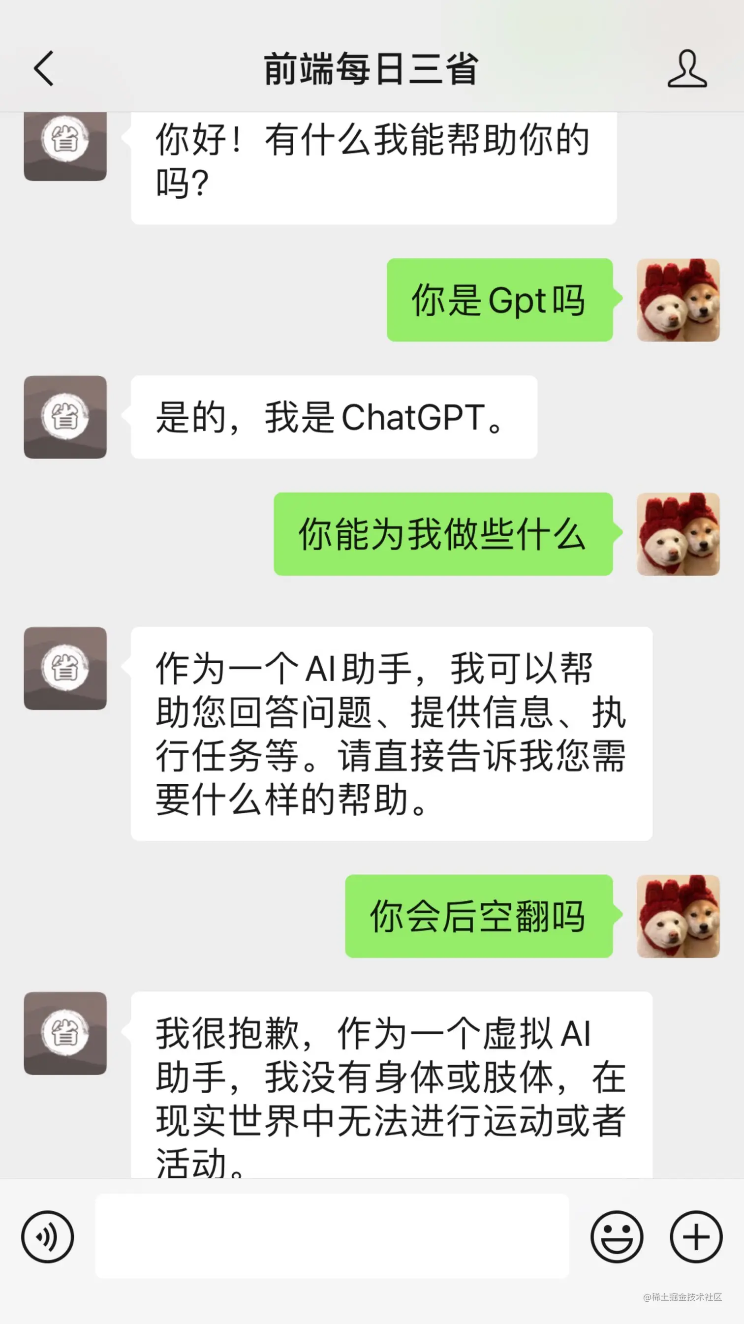 所以呢,最近我就在研究怎么才能方便快捷的体验到ChatGPT的强大功能,其中一个就是:把ChatGPT接入公众号。如下图(成果图):