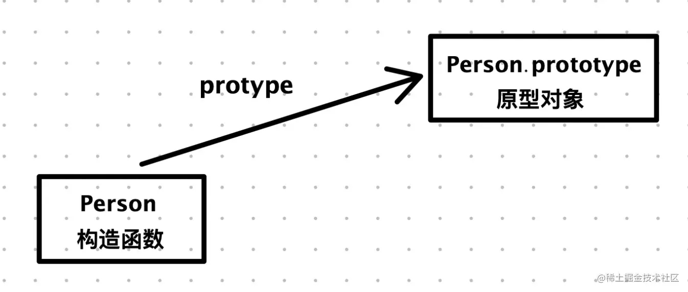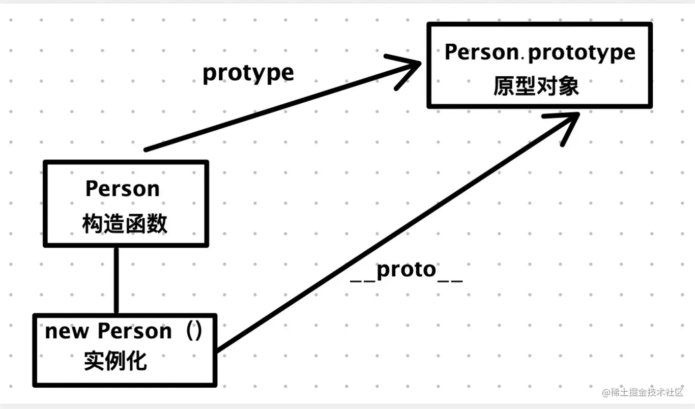 - prototype属性指向的就是Person的原型对象(每个除null外的JS对象在创建的时候都会关联到另一个对象,这个关联的对象就是原型)