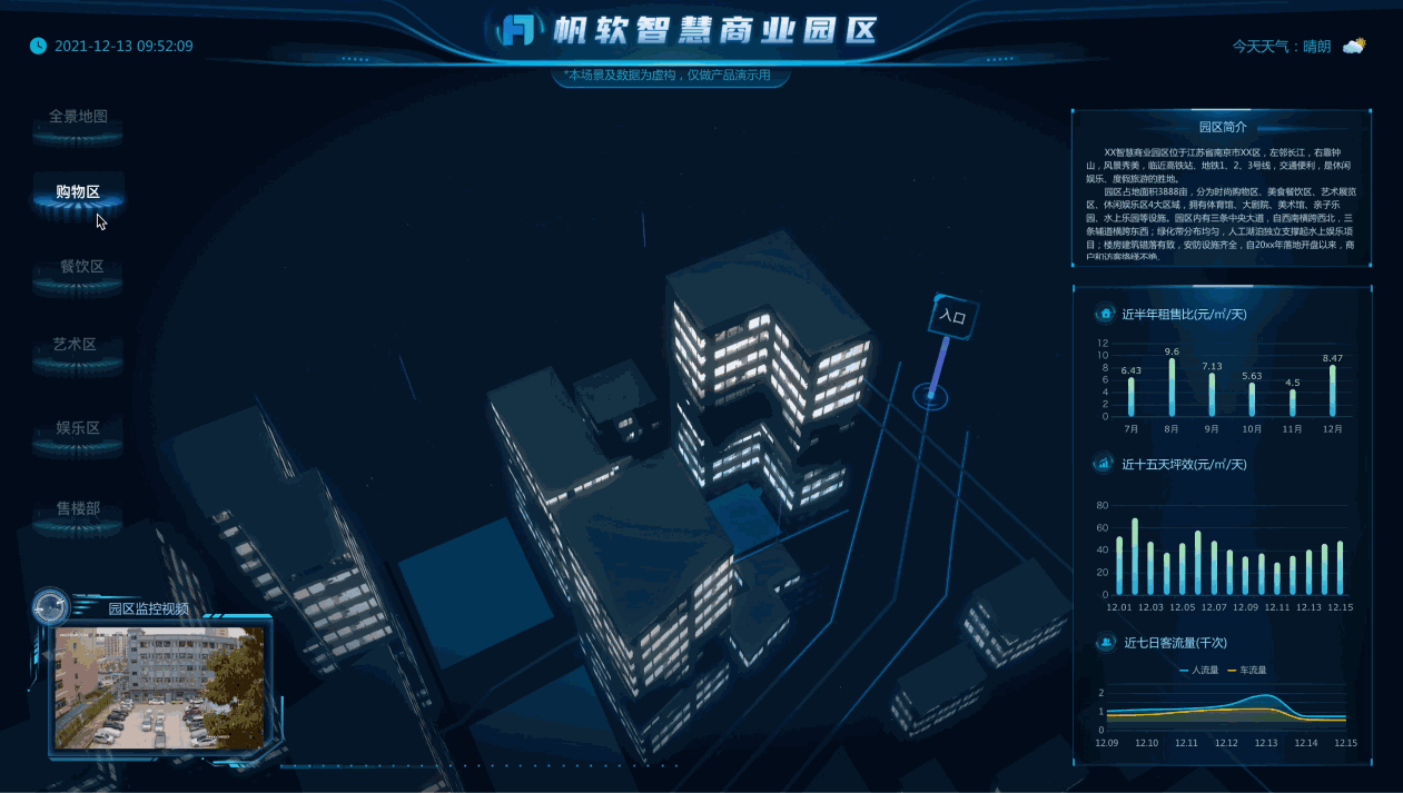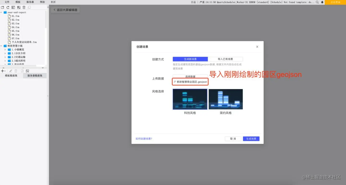 进入FVS大屏编辑界面,使用“三维城市”组件导入刚刚绘制的园区geojson。