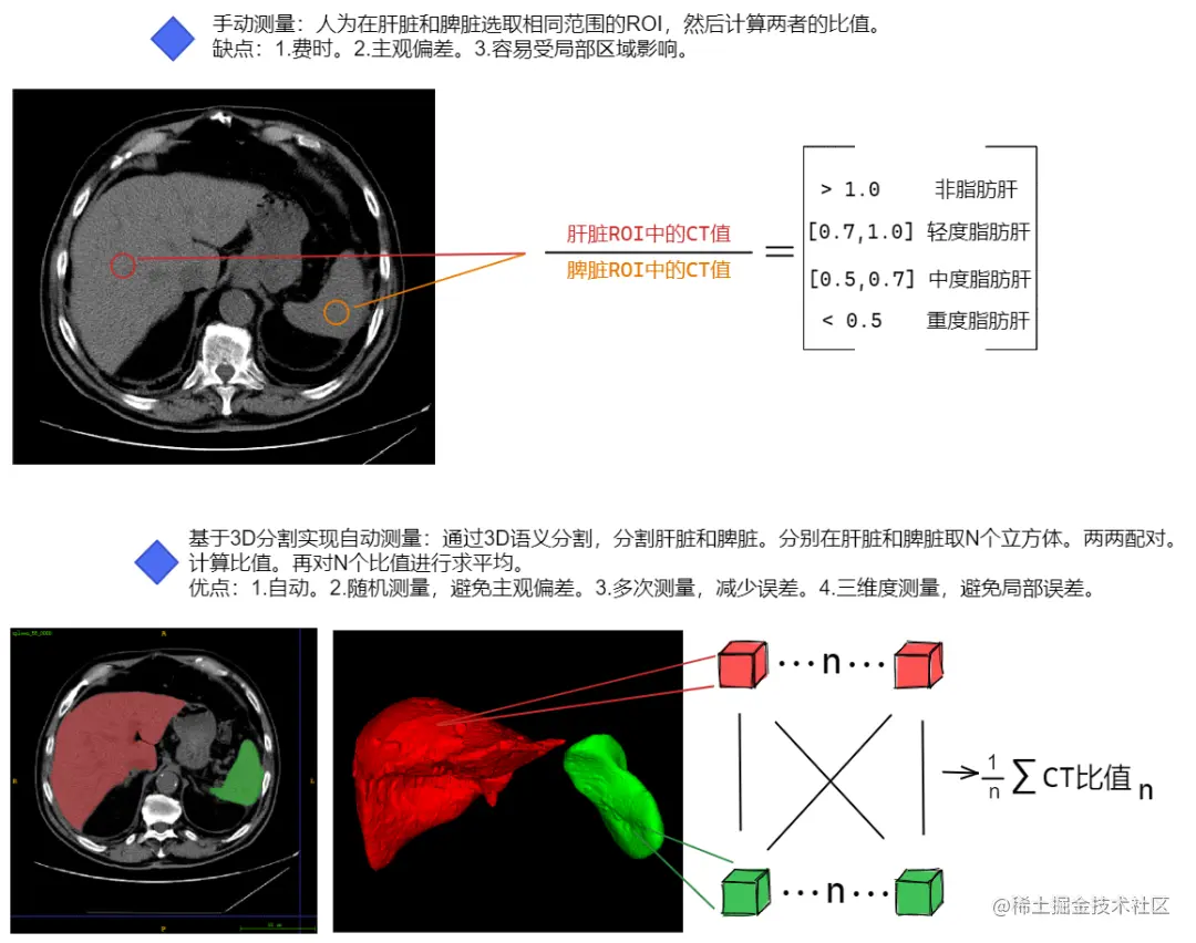 目前,深度学习技术中的语义分割正被广泛应用于医学领域。该技术可以通过训练模型来预测出影像中的不同组织类型的精确边界、位置和区域,在腹部CT上自动获得肝脏和脾脏的分割结果,对肝脏和脾脏多次随机取出一定体积的立方体来计算CT总值的比值,从而评估被检测者是否有脂肪肝以及脂肪肝的严重程度。这种方式减轻医生的工作强度,也避免人为的主观性带来的偏差。如下图展示人工测量和基于语义分割自动测量之间的优劣。关注 AI Studio 项目和我一起讨论️