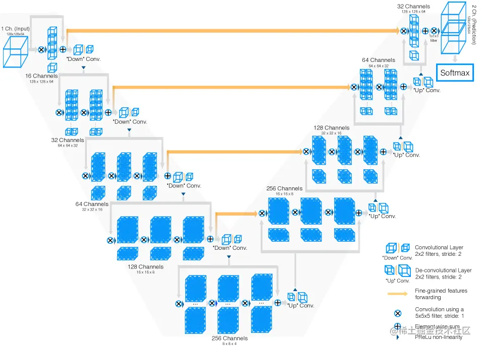 相对于二维语义分割,三维语义分割利用体素的三维结构信息来分割医学影像,具有更强的抓取空间信息的能力。因为三维分割利用了周围邻近切片及沿着z轴的轴向信息,具有更好的上下文信息,进一步提高了模型的泛化能力。此外,三维语义分割相较二维语义分割也有利于消除噪声和伪影的影响。当前使用的医疗影像数据具有较高的空间分辨率且为三维影像数据,因此使用三维语义分割模型进行分割通常是更适合的处理方式。这次使用的三维语义分割模型 VNet 采用了一种自下而上的方法,并且使用了 U 形连接搭建网络结构,以捕捉到影像数据的不同尺度的细节信息。由于相邻的体素往往具有密切的相关性,因此 VNet 引入了 3D 卷积、转置卷积操作以及残差 U 形连接来捕获和应用融合上下文信息,从而提高模型的精度和泛化能力。分割医疗影像数据时,由于病变区域可能会占整个影像的很小一部分,导致标注数据的分布不均衡,VNet 提出 Dice 损失函数,来减少不平衡分布对模型训练的影响,使模型更加稳定。VNet 整体结构如下。