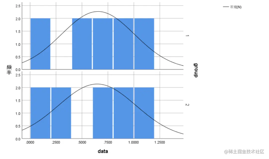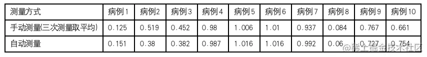 使用 Mann-Whitney U 检验判断手动测量与自动测量水平是否有差异。根据直方图判断两组测量结果分布的形状基本一致。人工测量的中位数为0.714,自动测量的中位数为0.740。Mann-Whitney U 检验结果显示,人工测量与自动测量差异无统计学意义(U=48.000,P=0.912)。
