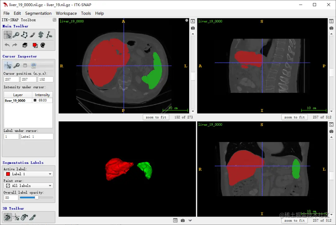 用医疗软件 itk-snap 软件读取原始数据和对应分割标签,展示效果如下图: