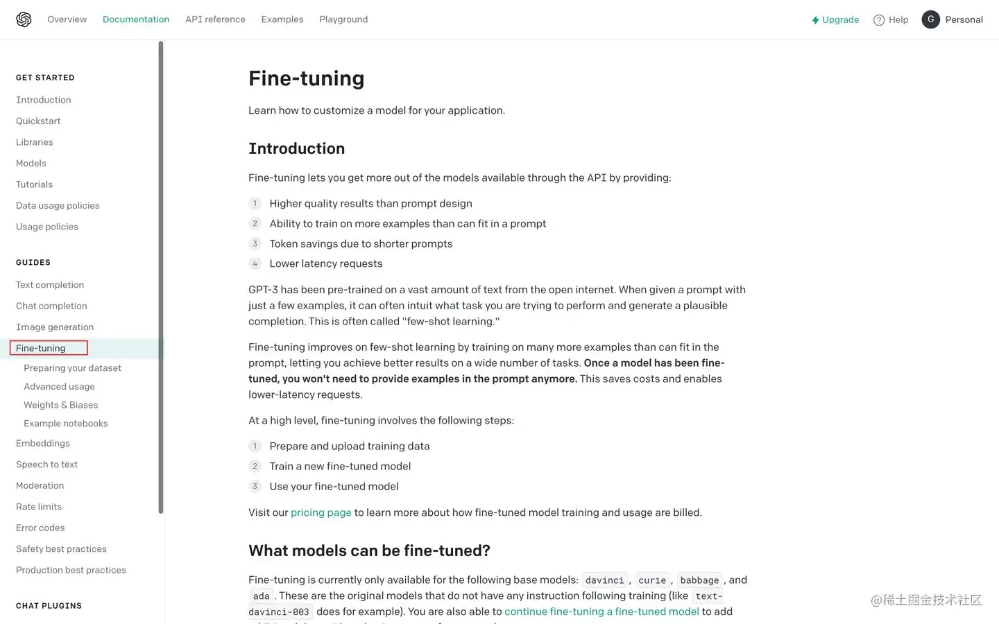 相关接口文档可以官网顶部 Documentation中 点进去,然后在右边菜单栏找到 FineTuing。