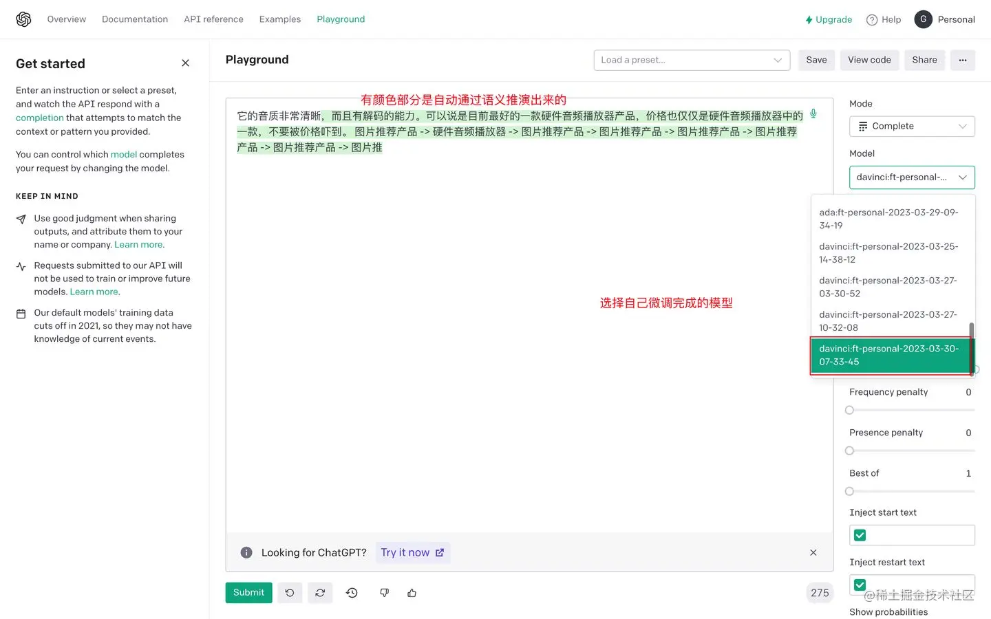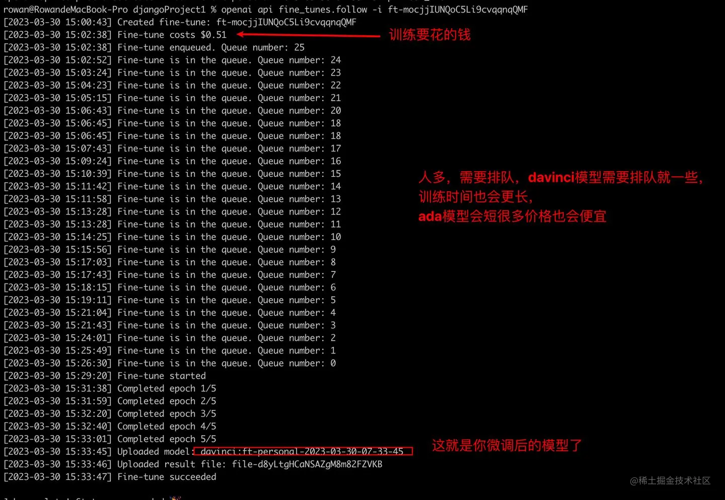 export OPENAI_API_KEY="<OPENAI_API_KEY>" 设置环境变量,在你自己的API_KEY中进行微调 openai api fine_tunes.create -t <TRAIN_FILE_ID_OR_PATH> -m ada --n_epochs=可以根据自己的数据集设置 默认是4