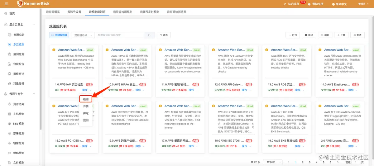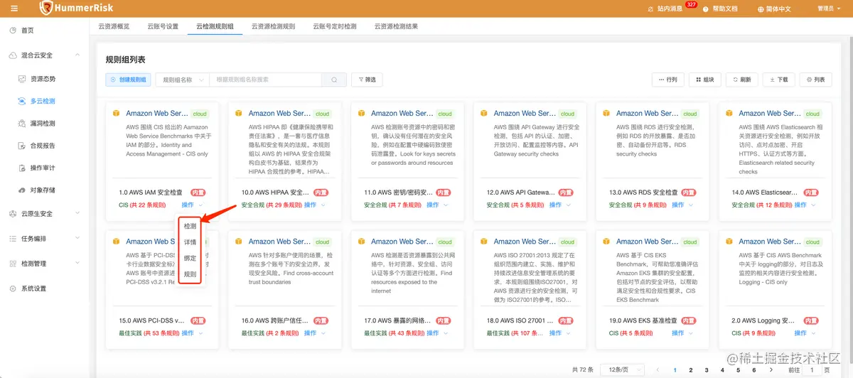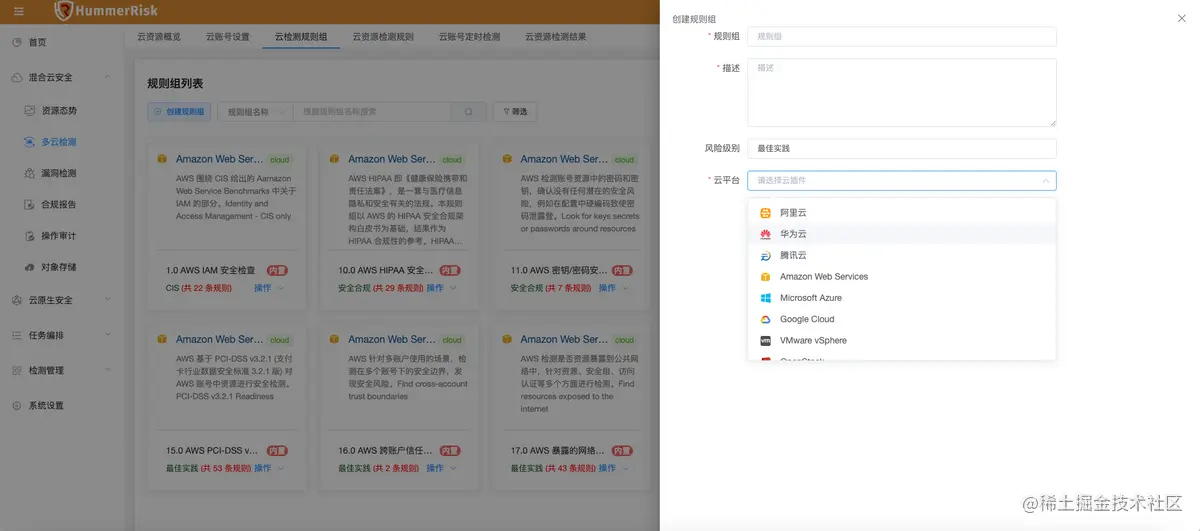 检测规则组是规则的使用载体,在HummerRisk中,实际执行规则、分析结果等都是基于规则组进行。设计规则组的目的是为了更加灵活的依据业务和场景进行检测,例如场景的合规要求(比如等保、HIPPA)都可以定义为规则,并可以灵活扩展。