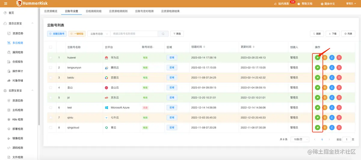 - 找到希望检测的云账号,点击云账号后面的“一键检测”按钮