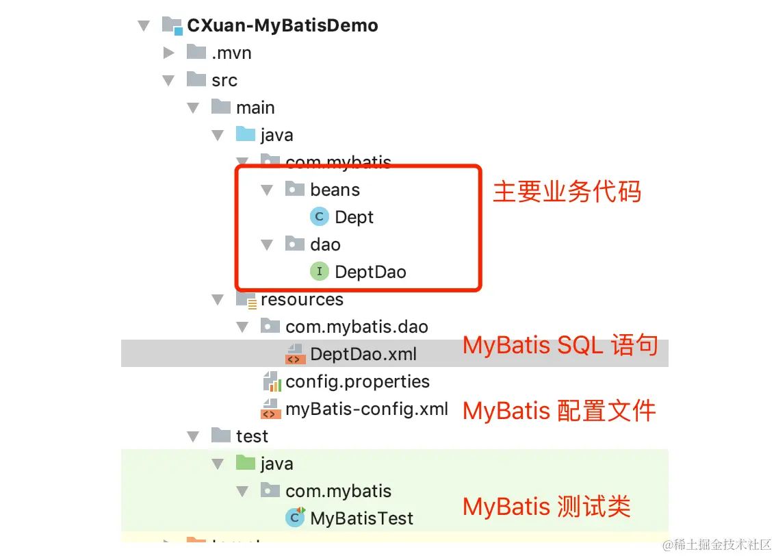 MyBatis 中的 SQL 语句和主要业务代码分离,我们一般会把 MyBatis 中的 SQL 语句统一放在 XML 配置文件中,便于统一维护。