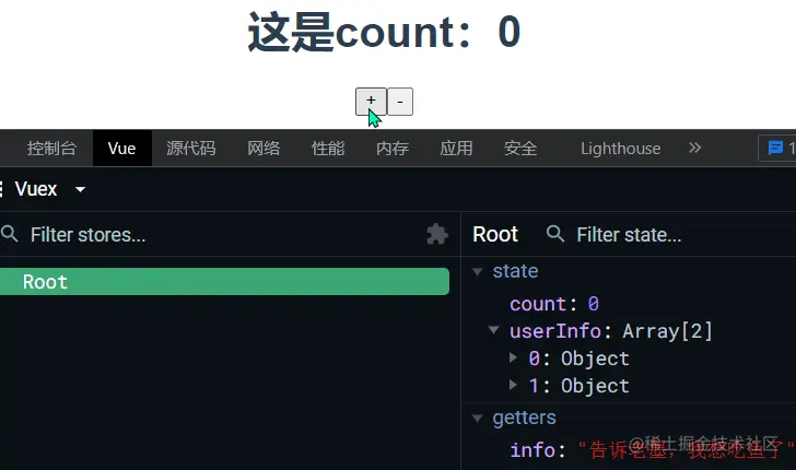 观察上图发现:在点击改变count值时,虽然页面跟着变化了,但是vuex检测系统并没有变化,只有鼠标去触发才会更新