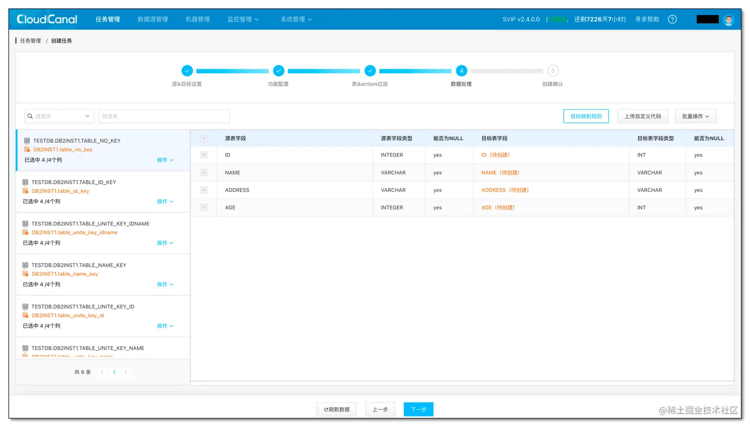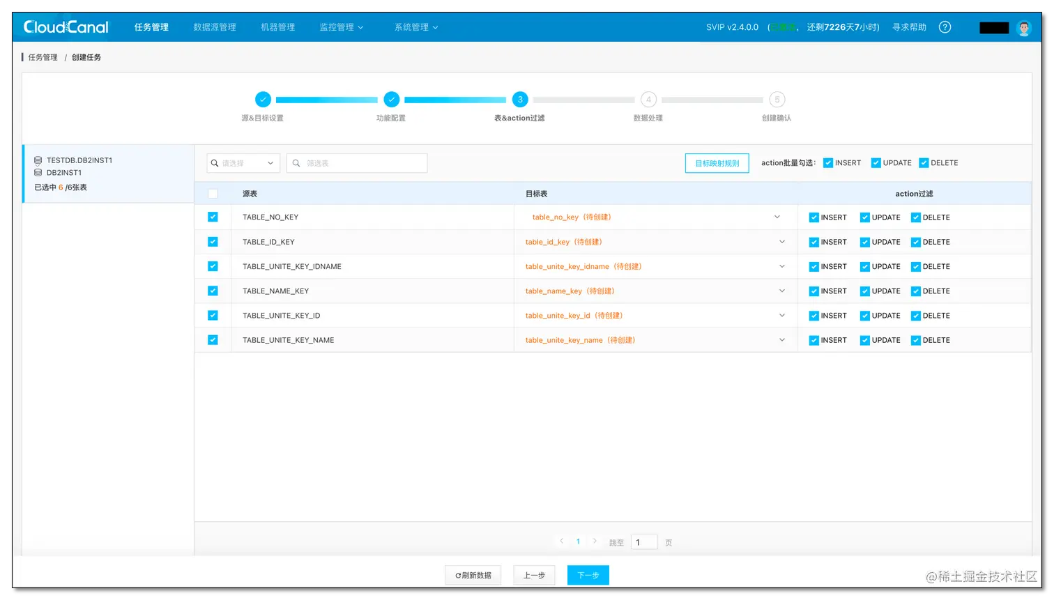 CloudCanal 创建 Db2 数据迁移同步任务是完全可视化的,通过获取数据库元数据,让用户在 web 页面上决定哪些库、表、列进行迁移同步,或者设定过滤条件、自定义数据处理逻辑等。