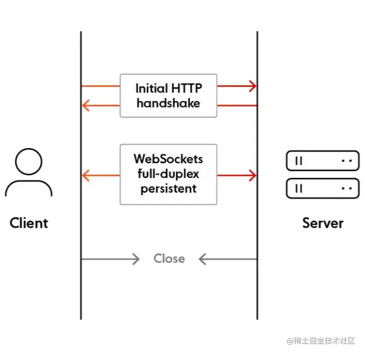 WebSocket 是应用层第七层上的一个应用层协议,它必须依赖 HTTP 协议进行一次握手 ,握手成功后,数据就直接从 TCP 通道传输,与 HTTP 无关了。也就是说WebSocket 分为握手和数据传输阶段(HTTP握手 + 双工的TCP连接),还有最后关闭连接阶段,如下图: