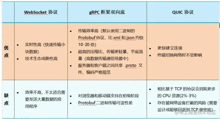在网络应用的快速发展中,新型的通信协议不断涌现,而 WebSocket、gRPC 和 QUIC 都是现代网络通信技术中的重要协议和技术,在不同的应用场景中,它们之间存在着一定的相同和差异。接下来我们就以这三种技术的特点、差异和应用场景进行分析说明。