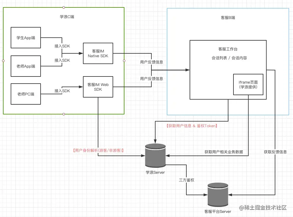 - C 端的客服SDK识别这个用户的身份信息, 连带提交的反馈信息传送到客服的数据库中