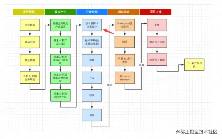 在笔者所在的前端研发流程中, 【技术调研及方案设计】属于连接【需求阶段】和【开发阶段】的中间节点。在需求详评(三审)后了, 需求的功能和交互已经基本确定, 而在实际进入开发之前, 还有一些待确定的技术要点需要补全, 这些要点包括