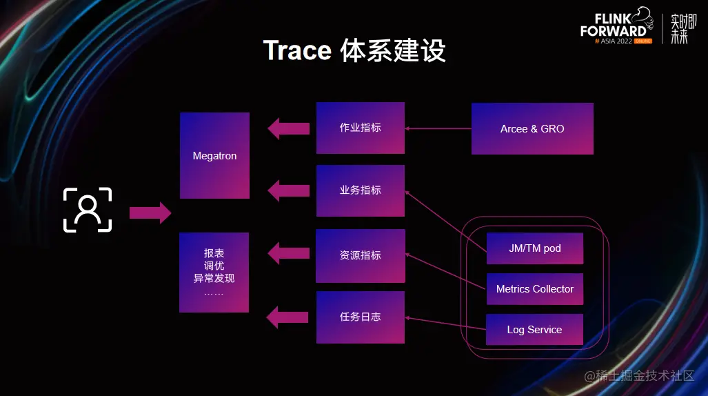 在 Flink on K8s 的环境中,日志和监控指标也是非常重要的,它可以帮助我们观察整个集群、容器、任务的运行情况,根据日志和监控快速定位问题并及时处理。所以也在 Flink 云原生化的过程中逐步构建了一套 Trace 体系。Flink 提供了业务指标,单机的 Metrics Collector 组件提供了物理机指标和容器指标。在日志方面,通过每个 Node 上运行的 Log Agent 采集指定路径的日志自动上传至日志平台进行解析查询。所有的指标和日志,都可以基于 Megatron 的平台化实时查询,也提供了具体的数据表,用户可以根据需求进行更高阶的查询,比如制作报表,作业调优,作业异常发现等。