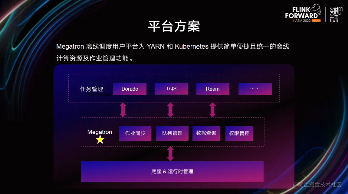 为了实现前后架构基础管理和周边能力的打平,构建了一套前后复用的资管架构平台方案——Megatron 离线调度用户平台,主要是为了方便多业务平台查询接入,缓解底层 YARN 的查询压力。以上的定位和功能设计使 Megatron 成为最适合做架构屏蔽的平台。不仅为多种业务平台提供统一的接口,也具备较完整的作业和队列管理能力。其中,主要功能有作业同步、队列管理、数据查询、权限管控等。因此,Megatron 针对新的云原生底座进行了适配,成为了一个为 YARN 和 Kubernetes 同时提供简单便捷且统一的离线计算资源及作业管理平台。