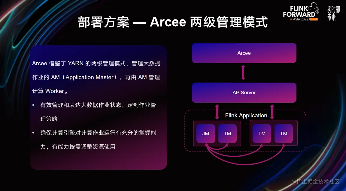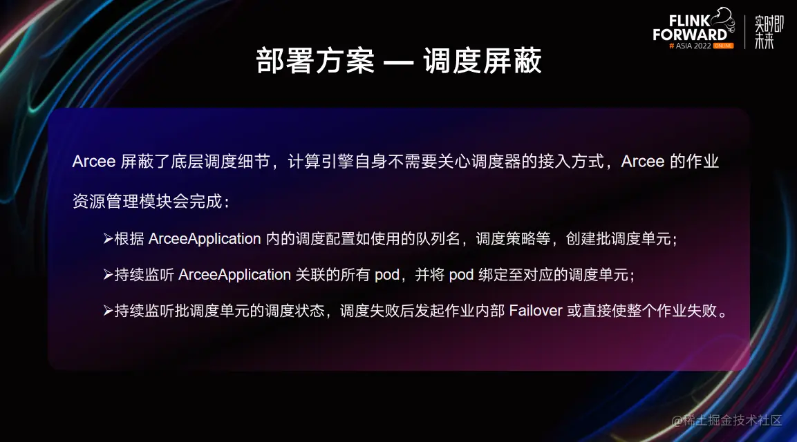 - 调度屏蔽:对于 Flink 大数据作业来说,往往需要搭配使用批调度器。批调度器与普通的调度器不同的点在于,批调度器使用的时候 需要额外创建批调度单元,并持续观察批调度端元的状态。目前,业界没有给出一个标准的批调度处理模式。Arcee 屏蔽了底层调度细节,计算引擎自身不需要关心调度器的接入方式,Arcee 的作业资源管理模块可以完成调度对接。