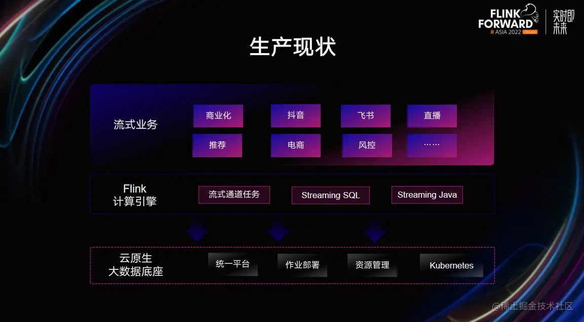 Flink 云原生化在字节跳动的生产实践情况。目前,流式通道任务,Streaming SQL,Streaming Java 等流式任务,都已完成云原生构架的适配。包括抖音、电商、推荐在内的几乎所有 Flink 业务,都已实现了新架构的接入。此外,这一整套架构也已实现了产品化的进程。