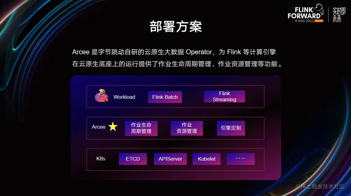 为了更方便的管理 Flink 等大数据负载,字节自研了一个统一的大数据 Operator Arcee。如图所示,Arcee 运行在 K8s 底座之上,向上可以同时支持 Flink 的流式和批式作业。Arcee 的核心能力主要包括作业生命周期管理、作业资源管理和一些引擎的定制功能等。
