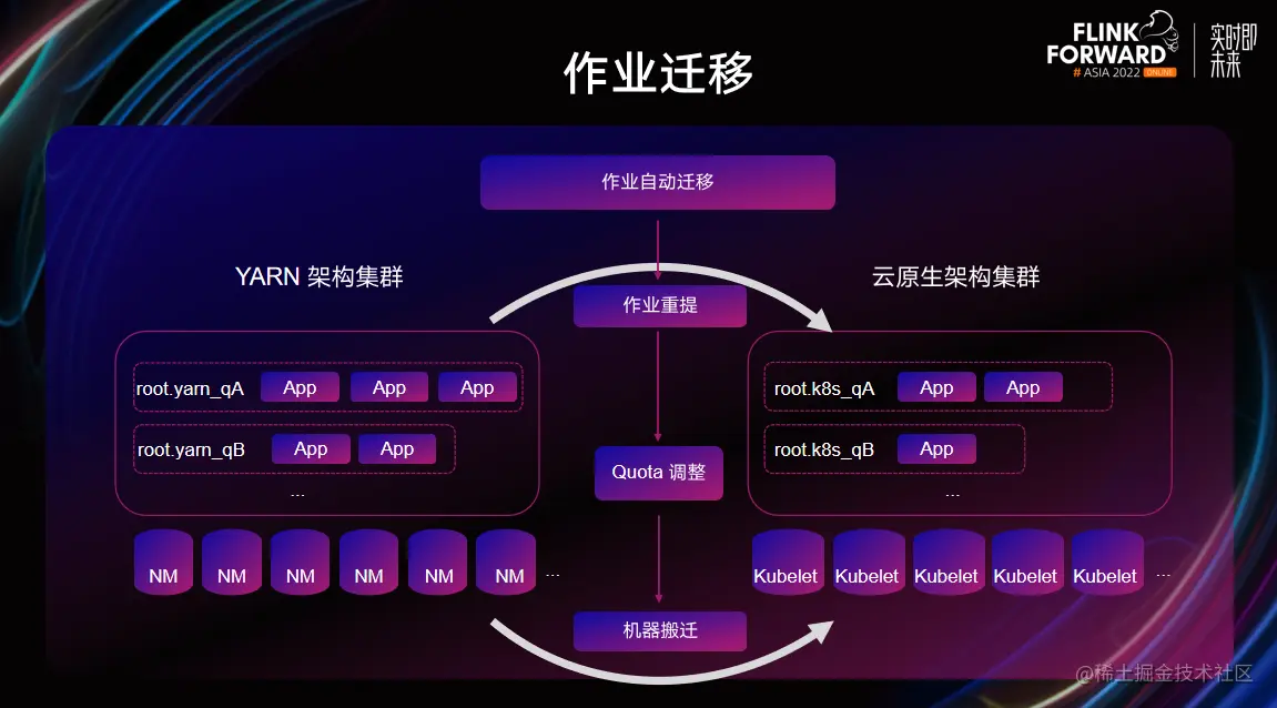 为了加快公司内架构迁移的进展,构建了一套自动迁移流程。通过定期梳理待迁移的作业列表,并按照一定频率触发作业的队列切换重启,Quota 平台会相应的进行迁移前队列的缩容和后续队列的持续扩容,机器就会从老架构集群搬迁至新架构集群。在实际的迁移过程中,自动化迁移可以达到接近 1000 /天的作业迁移速度。
