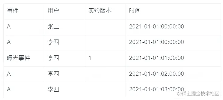 集成 SDK 调用 A/B 分流方法的同时会上报一条实验曝光事件记录用户的进组信息,后续指标计算认为发生在进组之后的事件受到了实验版本的影响。举个例子: