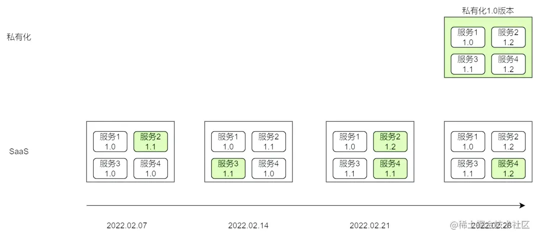 由于私有化和 SaaS 服务在架构、实现、基础底座上均存在不同,上述的发布节奏会带来一个明显的问题: