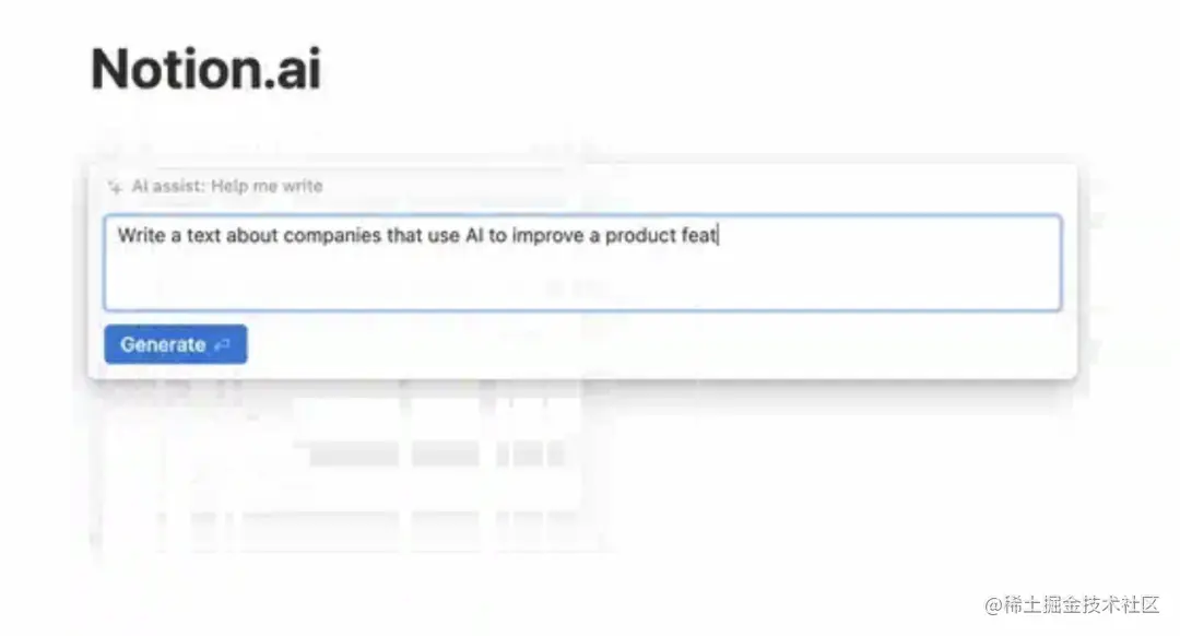 生产力工具Notion就是一个很好的例子。Notion本是一个记事工具,但最近添加了一个快捷方式,用于通过prompt生成文本(基本上是简单调用OpenAI的API)。虽然这不是Notion的核心功能,但对于其用户来说,却是一个很有价值的补充功能,因为这使得用户可以直接在Notion中生成文本,而不用在其他地方生成好再复制粘贴过来。