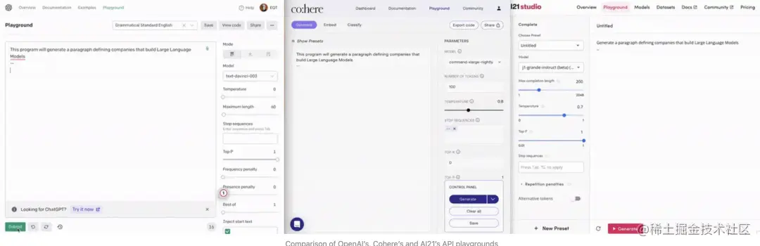 AI内核公司致力于构建实际的大型语言模型,并将模型的商业化作为主要的收入来源。OpenAI是当前最为著名的公司,不过也存在许多其他公司,如AI21、Anthropic和Cohere。请参阅以下示例,了解OpenAI、Cohere和AI21的API测试平台(playground)和输出。