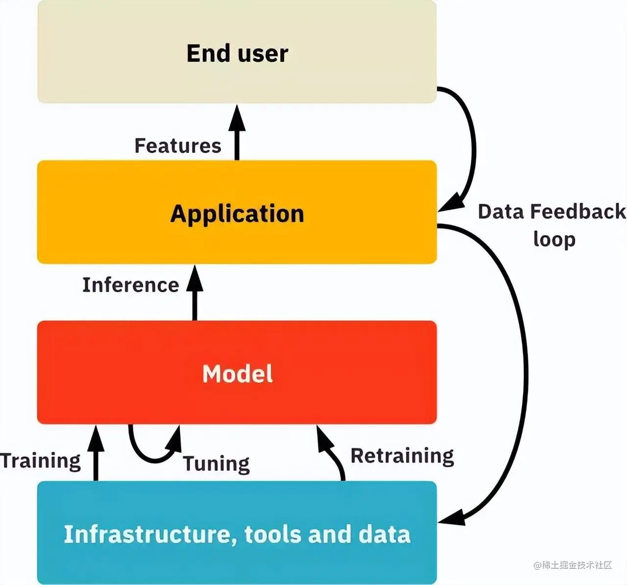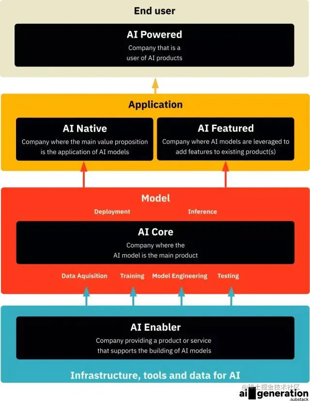 首先,AI赋能公司提供训练数据,AI内核公司用这些数据来训练LLM,然后AI原生或AI特色公司使用LLM来开发应用程序。